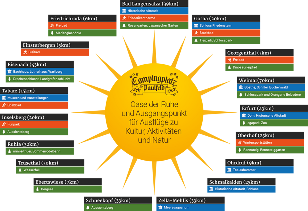 Kurzurlauber, Waldromantiker, naturbegeisterte Outdoorsportler und E-Biker kommen hier genauso auf Ihre Kosten wie Radwanderer, Motorradfahrer, Globetrotter oder Langzeit-Camper. Entdecken Sie die Schönheiten der Thüringer Städte und des Thüringer Waldes vom Campingplatz Paulfeld aus und freuen Sie sich auf schöne und erholsame Tage.